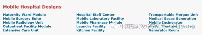 這種裝配式醫(yī)院研發(fā)多種成品模塊可自由選擇進(jìn)行組合拼裝,包括:產(chǎn)房模塊、移動(dòng)手術(shù)室、移動(dòng)放射科、門診模塊、重癥監(jiān)護(hù)室模塊、醫(yī)院職工中心、移動(dòng)實(shí)驗(yàn)室設(shè)施、移動(dòng)藥房模塊、洗衣設(shè)施、廚房設(shè)施、移動(dòng)式停尸房、醫(yī)用氣動(dòng)系統(tǒng)、移動(dòng)式焚燒爐、水處理系統(tǒng)、發(fā)電機(jī)房等。