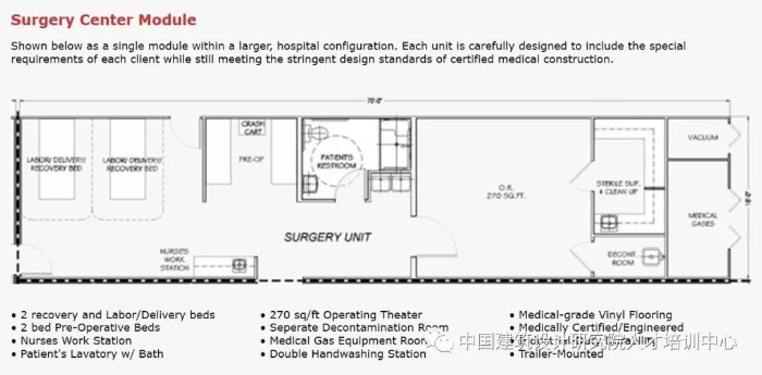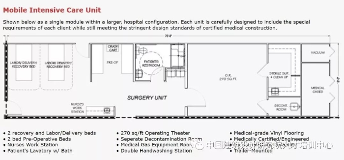 跨模塊移動(dòng)醫(yī)院系統(tǒng)提供最先進(jìn)的、完全可擴(kuò)展的裝配式醫(yī)院,成本低于傳統(tǒng)建筑建造。裝配式醫(yī)院在國(guó)外也需要經(jīng)過(guò)醫(yī)學(xué)認(rèn)證,專為商業(yè)服務(wù)和快速應(yīng)急部署而設(shè)計(jì)。這種跨模塊醫(yī)院可為農(nóng)村、救災(zāi)、人口遷移、醫(yī)院改擴(kuò)建、軍事需要和人道主義援助等快速建設(shè)。