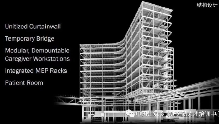 Miami Valley Hospital 是一個(gè)裝配式醫(yī)院建筑案例,這所醫(yī)院采用了單元式幕墻、模塊化可拆卸護(hù)士站、整體式MEP機(jī)架、裝配式病房等要素。