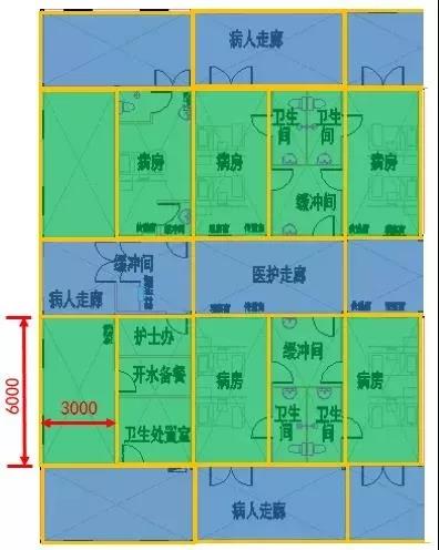 此次武漢火神山醫(yī)院、雷神山醫(yī)院的建造時(shí)間短、任務(wù)重,采用了模塊化建筑的形式?;鹕裆结t(yī)院的局部平面圖,可以看出,整個(gè)建筑是由若干個(gè)6m*3m的模塊,通過水平與垂直方向不同的組合方式,形成了病房、衛(wèi)生間、緩沖間、病人走廊、醫(yī)護(hù)走廊等等不同的功能分區(qū),基本解決了傳染病醫(yī)院的流線及分區(qū)問題。