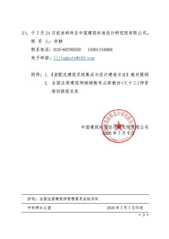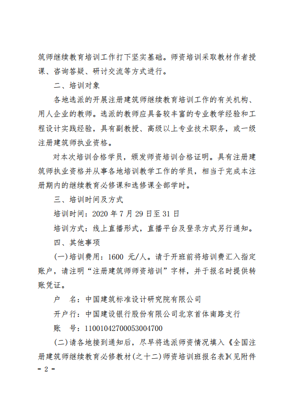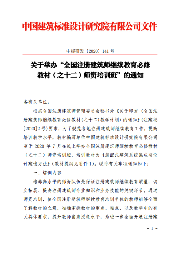 根據(jù)全國注冊(cè)建筑師管理委員會(huì)秘書處《關(guān)于印發(fā)〈全國注冊(cè)建筑師繼續(xù)教育必修教材(之十二)教學(xué)計(jì)劃〉的通知》(注建秘[2020]2號(hào))要求,為了規(guī)范各地注冊(cè)建筑師繼續(xù)教育工作,提高培訓(xùn)教學(xué)水平,教材編寫單位中國建筑標(biāo)準(zhǔn)設(shè)計(jì)研究院有限公司定于2020年7月在線上舉辦全國注冊(cè)建筑師繼續(xù)教育必修教材(之十二)師資培訓(xùn)班(中標(biāo)研發(fā)[2020]141號(hào)),培訓(xùn)教材為《裝配式建筑系統(tǒng)集成與設(shè)計(jì)建造法》。師資培訓(xùn)采取教材作者授課、咨詢答疑、研討交流等方式進(jìn)行。