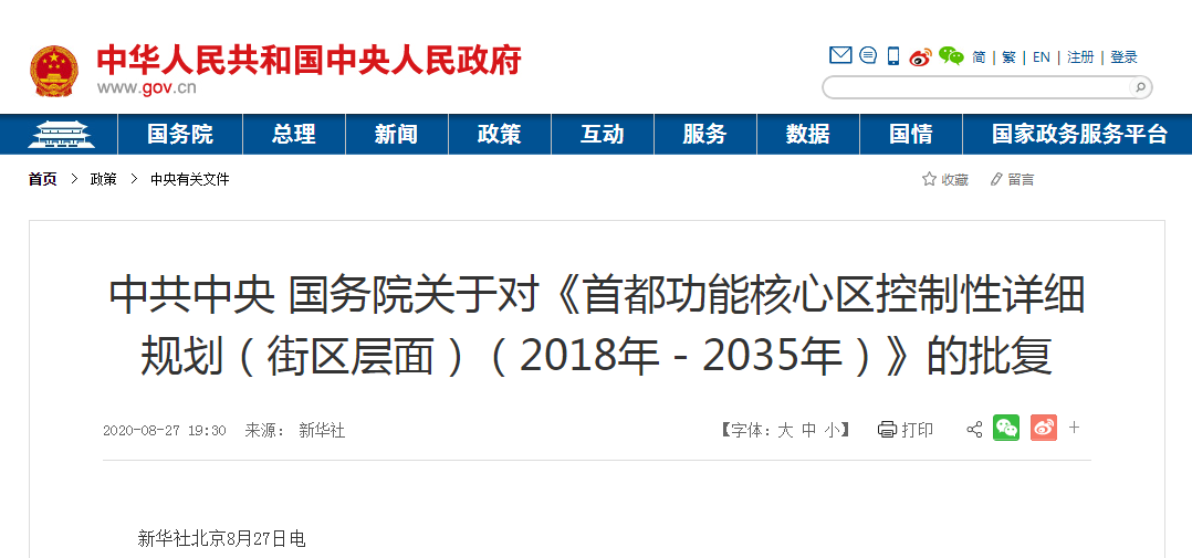 中共中央 國務(wù)院關(guān)于對《首都功能核心區(qū)控制性詳細規(guī)劃(街區(qū)層面)(2018年-2035年)》的批復(fù)