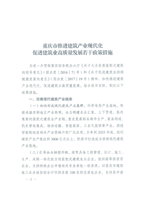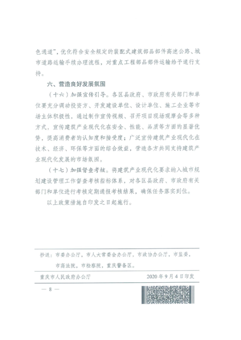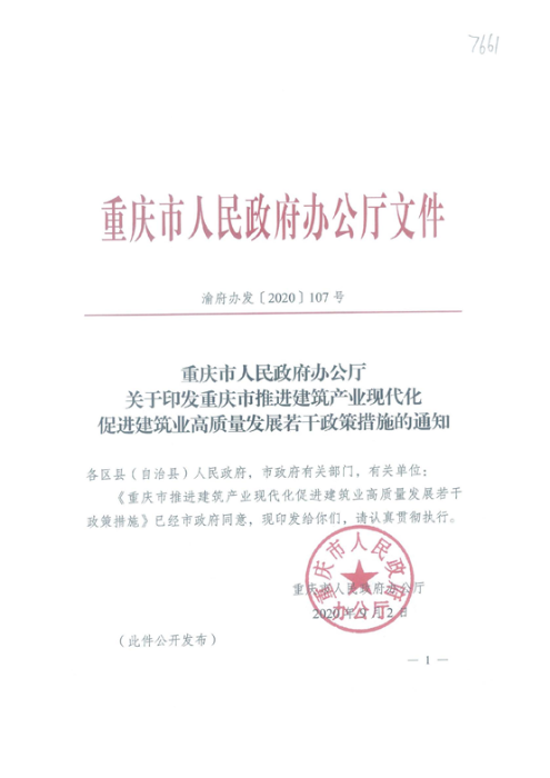 為進(jìn)一步貫徹落實(shí)國(guó)務(wù)院辦公廳《關(guān)于大力發(fā)展裝配式建筑的指導(dǎo)意見》(國(guó)辦發(fā)〔2016〕71號(hào))和《關(guān)于促進(jìn)建筑業(yè)持續(xù)健康發(fā)展的意見》(國(guó)辦發(fā)〔2017〕19號(hào))精神,加快推進(jìn)建筑產(chǎn)業(yè)現(xiàn)代化,促進(jìn)建筑業(yè)高質(zhì)量發(fā)展,重慶市人民政府辦公廳近日印發(fā)《推進(jìn)建筑產(chǎn)業(yè)現(xiàn)代化促進(jìn)建筑業(yè)高質(zhì)量發(fā)展若干政策措施》(渝府辦發(fā)〔2020〕107號(hào))。