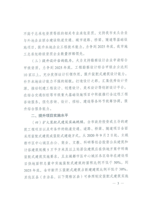 二、提升項(xiàng)目實(shí)施水平(四)擴(kuò)大裝配式建筑實(shí)施規(guī)模。全市政府投資或主導(dǎo)的建筑工程項(xiàng)目以及有條件的軌道交通、道路、橋梁、隧道項(xiàng)目全面采用裝配式建筑或裝配式建造方式。到2025年底,全市新開工裝配式建筑占新建建筑比例不低于30%。(五)嚴(yán)格裝配式建筑項(xiàng)目管理。建立裝配式建筑預(yù)制部品部件駐場(chǎng)建造制度,將質(zhì)量監(jiān)督延伸至工廠。(六)實(shí)施建筑品質(zhì)提升行動(dòng)。以裝配式建筑為突破口,提供高品質(zhì)建筑產(chǎn)品,推動(dòng)解決住宅質(zhì)量通病問題。制定住宅性能標(biāo)準(zhǔn),把人民群眾普遍關(guān)心的安全、健康、通風(fēng)、采光、遮陽、智能等性能作為住宅建設(shè)的重要指標(biāo)。發(fā)展綠色建筑,進(jìn)一步提高政府投資項(xiàng)目、大型社會(huì)投資項(xiàng)目二星級(jí)綠色建筑實(shí)施比例。制定健康建筑工程建設(shè)技術(shù)標(biāo)準(zhǔn),引導(dǎo)發(fā)展健康建筑。繼續(xù)實(shí)施施工現(xiàn)場(chǎng)形象品質(zhì)提升行動(dòng)計(jì)劃,強(qiáng)化文明施工管理。