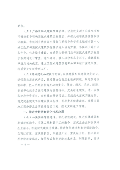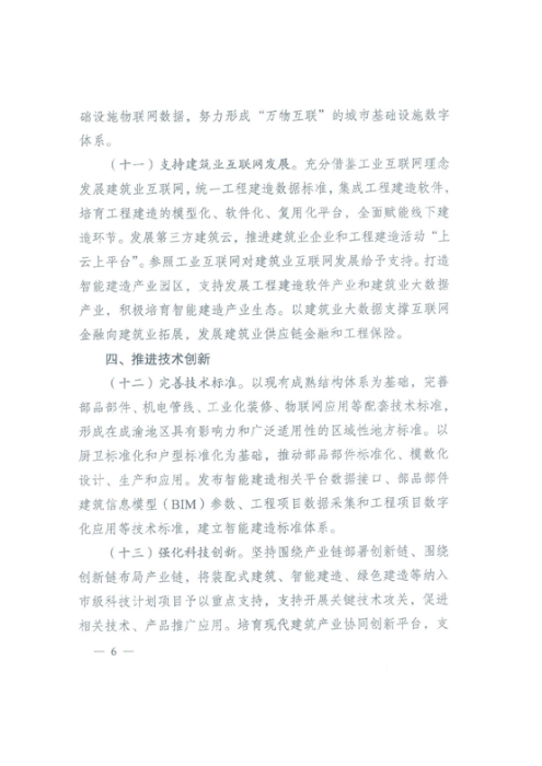 四、推進(jìn)技術(shù)創(chuàng)新(十二)完善技術(shù)標(biāo)準(zhǔn)。以現(xiàn)有成熟結(jié)構(gòu)體系為基礎(chǔ),完善部品部件、機(jī)電管線、工業(yè)化裝修、物聯(lián)網(wǎng)應(yīng)用等配套技術(shù)標(biāo)準(zhǔn),形成在成渝地區(qū)具有影響力和廣泛適應(yīng)性的區(qū)域性地方標(biāo)準(zhǔn)。(十三)強(qiáng)化科技創(chuàng)新。