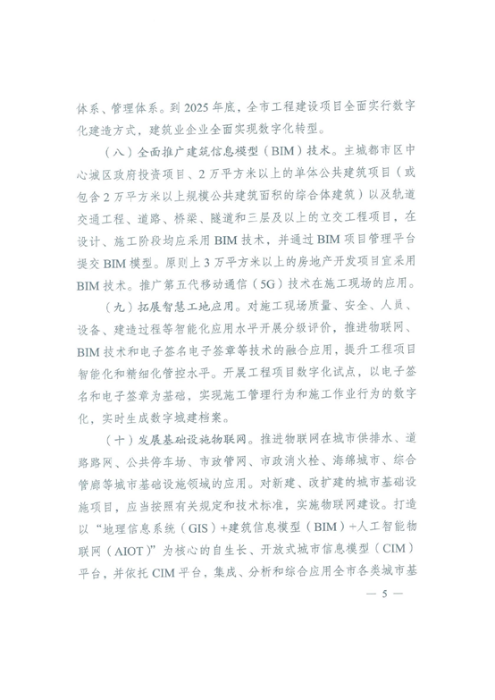 三、推進(jìn)大數(shù)據(jù)智能化技術(shù)應(yīng)用(七)加快實(shí)施智能建造。到2025年底,全市工程建設(shè)項(xiàng)目全面實(shí)行數(shù)字化建造方式,建筑業(yè)企業(yè)全面實(shí)現(xiàn)數(shù)字化轉(zhuǎn)型。(八)全面推廣建筑信息模型(BIM)技術(shù)。(九)拓展智慧工地應(yīng)用。對(duì)施工現(xiàn)場(chǎng)質(zhì)量、安全、人員、設(shè)備、建造過程等智能化應(yīng)用水平開展分級(jí)評(píng)價(jià),推進(jìn)物聯(lián)網(wǎng)、BIM技術(shù)和電子簽名電子簽章等技術(shù)的融合應(yīng)用,提升工程項(xiàng)目智能化精細(xì)化管控水平。(十)發(fā)展基礎(chǔ)設(shè)施物聯(lián)網(wǎng)。(十一)支持建筑業(yè)互聯(lián)網(wǎng)發(fā)展。發(fā)展第三方建筑云,推進(jìn)建筑業(yè)企業(yè)和工程建造活動(dòng)“上云上平臺(tái)”。