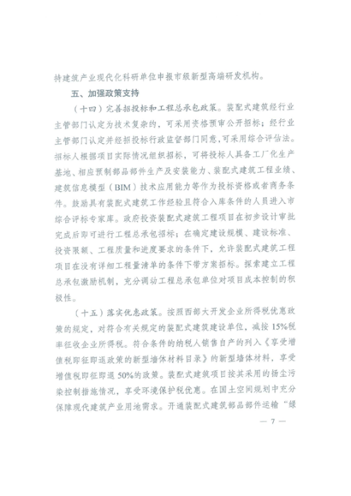 五、加強(qiáng)政策支持(十四)完善招投標(biāo)和工程總承包政策。(十五)落實(shí)優(yōu)惠政策。按照西部大開發(fā)企業(yè)所得稅優(yōu)惠政策的規(guī)定,對(duì)符合有關(guān)規(guī)定的裝配式建筑建設(shè)單位,減按15%稅率征收企業(yè)所得稅。