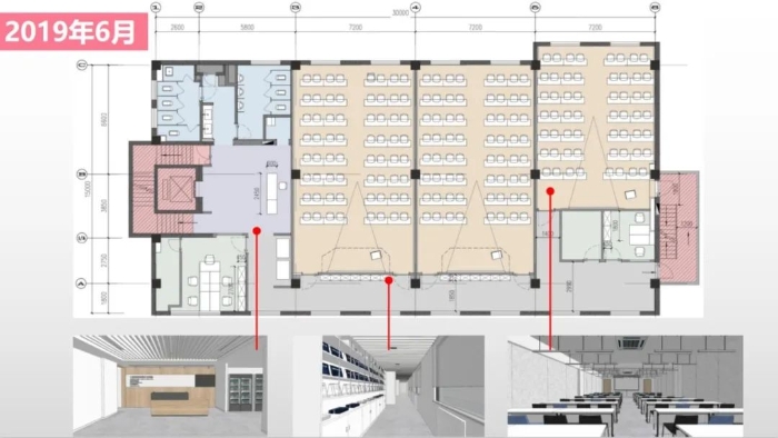疫情到來之前學校為了滿足多多開班、同時開班、大量招生的要求,設(shè)計了三間大教室,支持我們大量的面授教學。剛想加上小書店和教師休息室,再把方案調(diào)一調(diào),結(jié)果新冠就來了。
