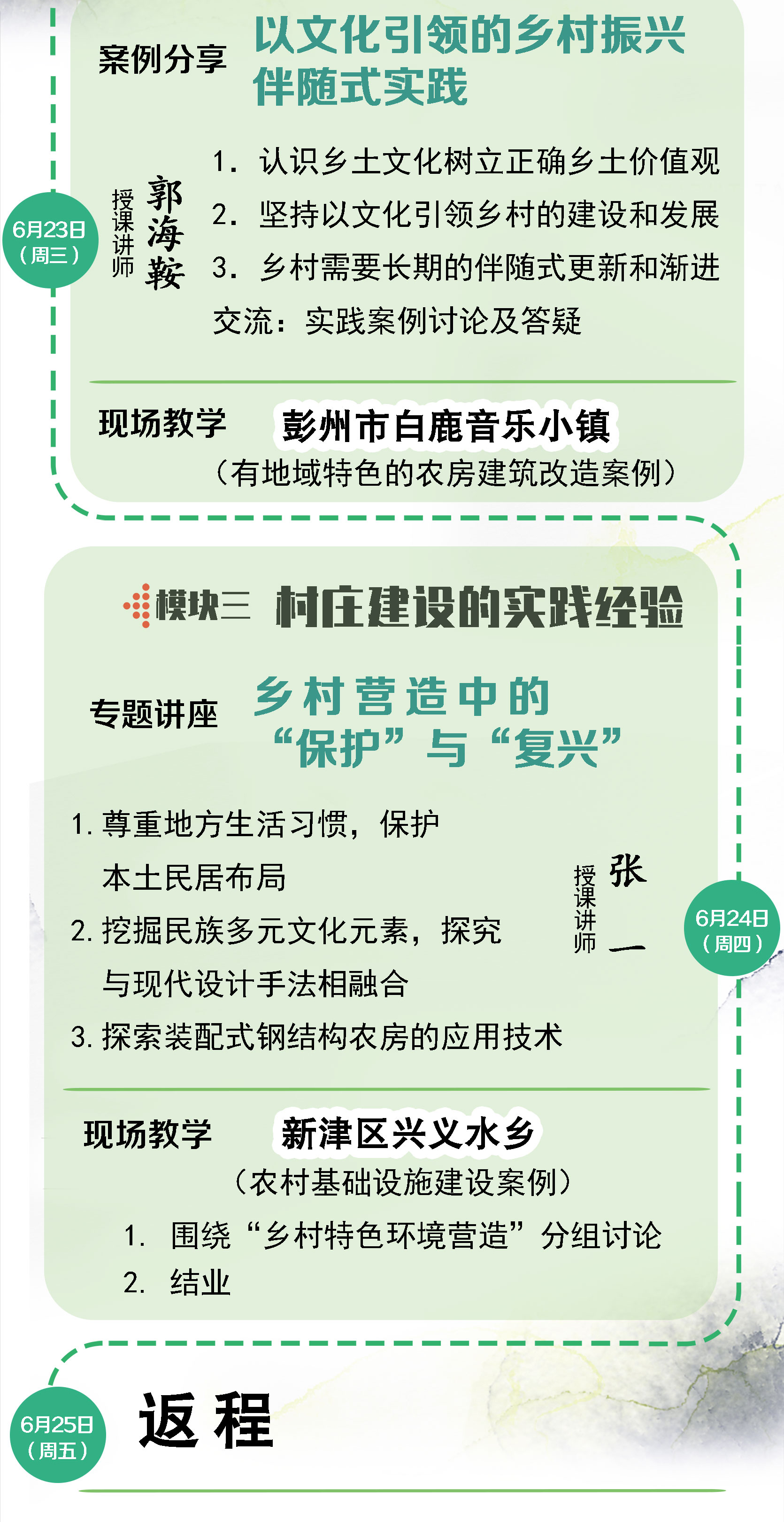 3、本課程結(jié)束后,修滿全部學(xué)時(shí)的學(xué)員將獲得雙證書:由四川戰(zhàn)旗鄉(xiāng)村振興培訓(xùn)學(xué)院頒發(fā)的結(jié)業(yè)證書,以及由中國(guó)建筑設(shè)計(jì)研究院人才培訓(xùn)中心頒發(fā)的結(jié)業(yè)證書。