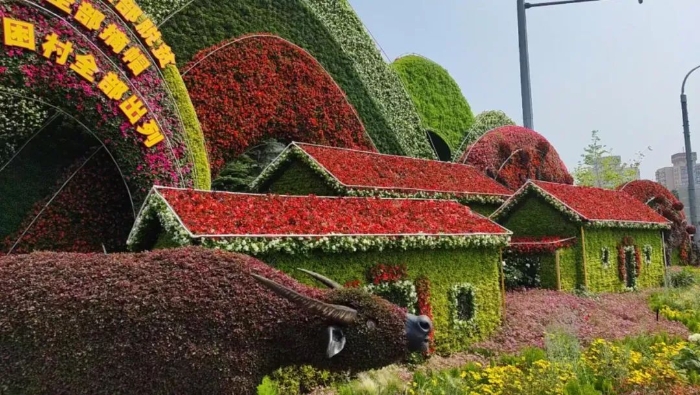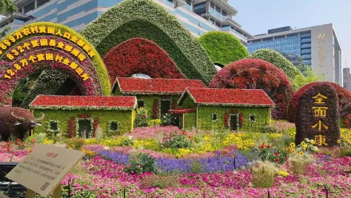 花壇以十八洞村舊貌換新顏的幸福生活為場景,體現(xiàn)在迎來中國共產(chǎn)黨成立100周年的重要時刻,全面建成小康社會取得偉大歷史性成就,決戰(zhàn)脫貧攻堅(jiān)取得決定性勝利。