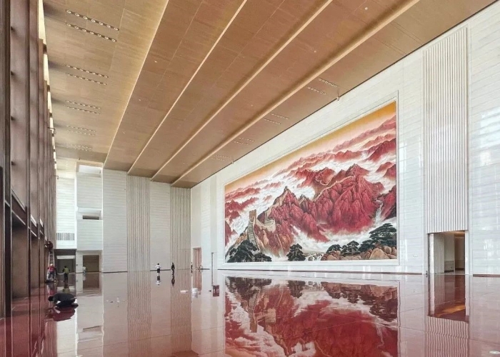 公共空間設(shè)計(jì)模數(shù)與建筑模數(shù)嚴(yán)格對(duì)應(yīng),推敲主題畫(huà)作在空間中的尺度關(guān)系;地面選用雅安紅石材(紅軍紅)與紅色為主基調(diào)的長(zhǎng)城畫(huà)作呼應(yīng),教育后人不忘革命史,走好新的長(zhǎng)征路。