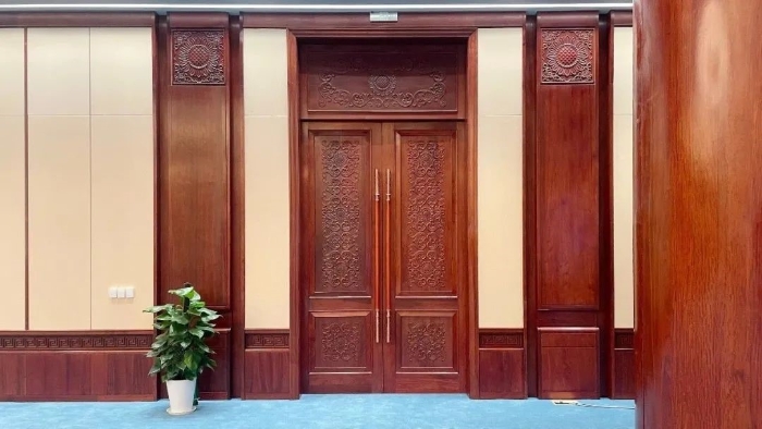 紅色大廳作為大型禮儀活動(dòng)場(chǎng)所,有著最為強(qiáng)烈的文化屬性和嚴(yán)格的空間布局。設(shè)計(jì)提取中國(guó)古典建筑藝術(shù)造型語(yǔ)素,結(jié)合時(shí)代背景特征,滿足現(xiàn)代化會(huì)議活動(dòng)使用需求。在營(yíng)造空間整體氣氛的同時(shí),注重人的尺度感受和細(xì)節(jié)把控,增強(qiáng)了空間的場(chǎng)所感。
