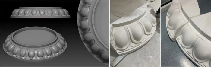 ▲漢白玉柱礎(chǔ)設(shè)計(jì)制作過(guò)程。柱礎(chǔ)樣式為覆盆式蓮瓣造型,采用拋光漢白玉,蓮花出淤泥而不染,徑直而中空,象征著黨的清正圣潔。