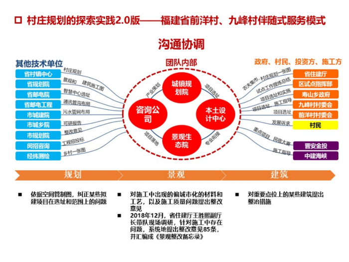 村莊規(guī)劃探索實踐:陪伴式服務(wù)模式。從整體村域規(guī)劃到具體建筑工程,規(guī)劃團隊提供村莊規(guī)劃,咨詢公司提供產(chǎn)業(yè)規(guī)劃,景觀團隊設(shè)計村莊景觀,建筑團隊設(shè)計單體工程。其他技術(shù)單位,包括省村鎮(zhèn)中心和專業(yè)院,提供基礎(chǔ)設(shè)施布局的前期數(shù)據(jù)和要求。政府、投資方、施工方、村民,多方合作提供共同締造的訴求和指導(dǎo)。