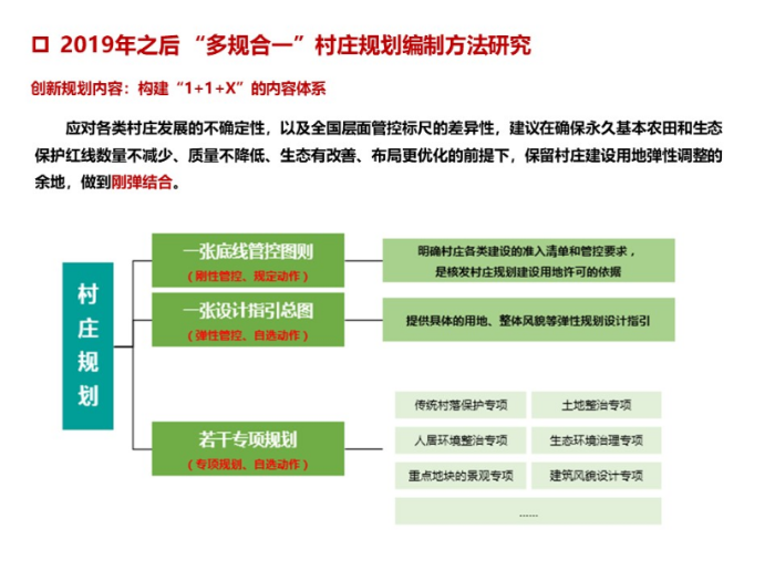 創(chuàng)新規(guī)劃內(nèi)容需要構(gòu)建1+1+X的內(nèi)容體系。注重底線管控,在鄉(xiāng)鎮(zhèn)級規(guī)劃中進行布局;有大量建設(shè)需求的村莊要做總體設(shè)計;有特殊資源的村莊,應(yīng)該做若干專項規(guī)劃,編制保護、整治等。不同的村莊根據(jù)實際需求,選擇編制1+1,有條件的和有特殊資源的,鼓勵編制X的若干專項規(guī)劃。