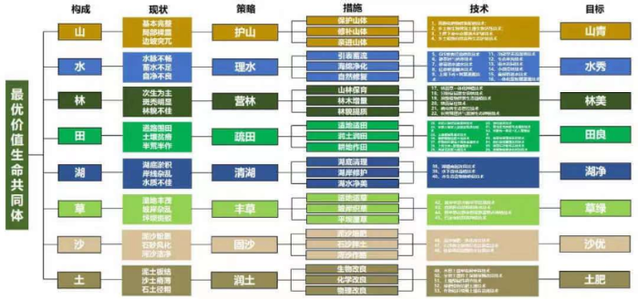 生態(tài)修復(fù)本著保護優(yōu)先、節(jié)約優(yōu)先、以自然恢復(fù)為主的方針,按照“謀劃定位、策劃功能、規(guī)劃塑形、計劃落地”四劃協(xié)同的工作方法,創(chuàng)新“摸清本底、自然恢復(fù)、生態(tài)修復(fù)、生物多樣性、生態(tài)設(shè)施、綠色建筑”六大生態(tài)規(guī)劃邏輯,抓住“水”和“土”兩個生態(tài)核心要素,以“留水-固土”為切入點,結(jié)合“護山-理水-營林-疏田-清湖-豐草-固沙”七大策略,綜合運用成熟、成套、低成本的生態(tài)技術(shù)、材料、產(chǎn)品、工法,形成一套可復(fù)制、可推廣的標(biāo)準(zhǔn)、標(biāo)準(zhǔn)圖、導(dǎo)則、指南,始終聚焦生態(tài)的風(fēng)景和風(fēng)景的生態(tài),建設(shè)以生態(tài)為魂、以風(fēng)景為象的,人與自然和諧共生的最優(yōu)價值生命共同體。