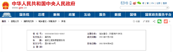 《建設工程抗震管理條例》已經2021年5月12日國務院第135次常務會議通過,現(xiàn)予公布,自2021年9月1日起施行。