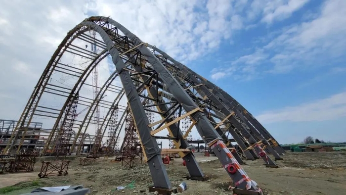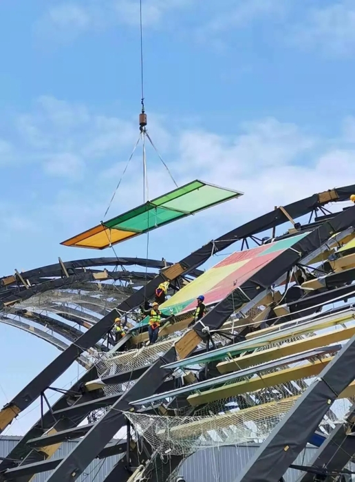 主展館項目采取世界首創(chuàng)的鋼木混合空腹桁架拱(鋼木結(jié)構(gòu))。整體為CNC加工木檁條+ETFE膜結(jié)構(gòu)體系。這座長在田野中的巨型建筑在工程技術(shù)上,運用了許多在成都乃至國內(nèi)都少見的高新技術(shù)、高級材料。