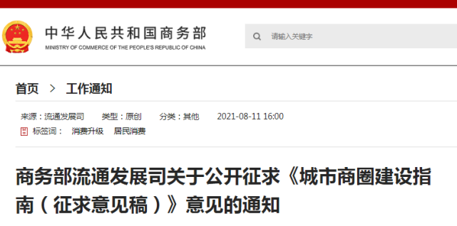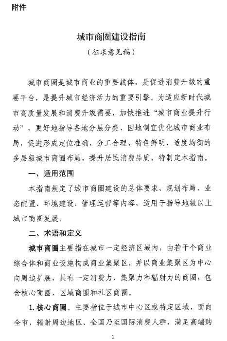 近日,商務部網(wǎng)站發(fā)布商務部流通發(fā)展司關于公開征求《城市商圈建設指南(征求意見稿)》意見的通知。涉及城市商圈建設的總體要求、規(guī)劃布局、業(yè)態(tài)配置、環(huán)境建設、管理運營等多個方面。