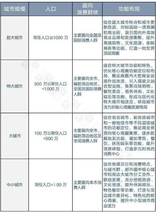根據(jù)《指南》的要求,核心商圈的分布主要集中在超大城市(常住人口大于1000萬)、特大城市(常住人口介于500萬~1000萬)、大城市(常住人口介于100萬~500萬)和中小城市(常住人口小于100萬)。