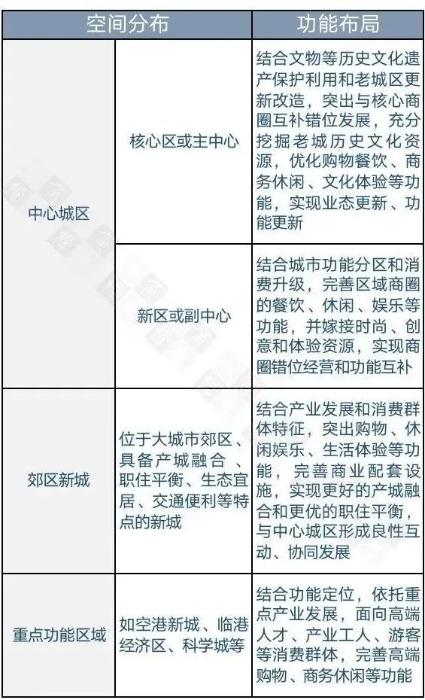 在功能布局方面,《指南》要求,位于中心城區(qū)的區(qū)域商圈,要根據(jù)不同城市規(guī)模等級和中心城區(qū)不同功能分區(qū)的功能定位,結合老城區(qū)更新改造,提升商圈綜合性服務功能。