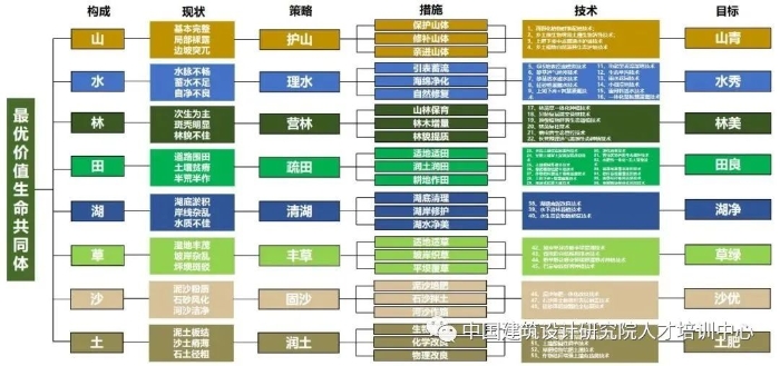 生態(tài)修復(fù)本著保護(hù)優(yōu)先、節(jié)約優(yōu)先、以自然恢復(fù)為主的方針,按照“謀劃定位、策劃功能、規(guī)劃塑形、計(jì)劃落地”四劃協(xié)同的工作方法,創(chuàng)新“摸清本底、自然恢復(fù)、生態(tài)修復(fù)、生物多樣性、生態(tài)設(shè)施、綠色建筑”六大生態(tài)規(guī)劃邏輯,抓住“水”和“土”兩個(gè)生態(tài)核心要素,以“留水-固土”為切入點(diǎn),結(jié)合“護(hù)山-理水-營(yíng)林-疏田-清湖-豐草-固沙”七大策略,綜合運(yùn)用成熟、成套、低成本的生態(tài)技術(shù)、材料、產(chǎn)品、工法,形成一套可復(fù)制、可推廣的標(biāo)準(zhǔn)、標(biāo)準(zhǔn)圖、導(dǎo)則、指南,始終聚焦生態(tài)的風(fēng)景和風(fēng)景的生態(tài),建設(shè)以生態(tài)為魂、以風(fēng)景為象的,人與自然和諧共生的最優(yōu)價(jià)值生命共同體。