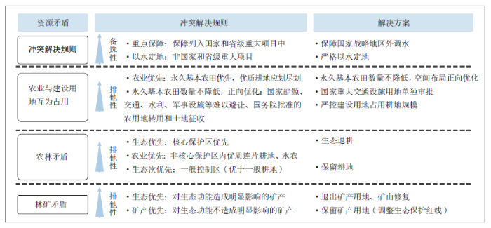 調(diào)整空間資源流向是落實空間格局調(diào)整,解決資源矛盾的直接途徑。各類資源矛盾沖突本質(zhì)上是對空間資源的爭奪,需要基于上述價值導向和沖突解決規(guī)則進行梳理,通過對資源流向的調(diào)整,解決資源和空間矛盾,進而落實空間格局調(diào)整和優(yōu)化的要求(圖7)。
