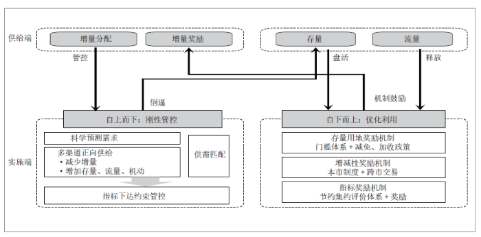 從空間格局落地實施角度看,需要確定空間資源再分配的導向和方案,包括空間資源總量、結(jié)構(gòu)、流向和供給。其核心作用包括兩大方面:一是作為國土空間規(guī)劃最核心的空間性管控內(nèi)容,直接服務(wù)于規(guī)劃意圖的實現(xiàn);二是通過差異化的空間資源配置促進用地結(jié)構(gòu)、空間匹配,以及土地資源利用方式的優(yōu)化。其中,空間資源總量需要匹配空間需求,空間資源結(jié)構(gòu)需要匹配分類空間,空間資源流向需要解決空間矛盾,空間資源供給需要集約導向。