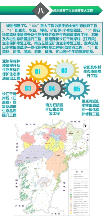 《規(guī)劃》將全省生態(tài)修復(fù)布局在“一帶、二核、三網(wǎng)、六區(qū)”上,聚焦全省生態(tài)、農(nóng)業(yè)、城鎮(zhèn)以及礦山主要生態(tài)問題和主攻方向,提出了以“456”重大工程為抓手的全省生態(tài)修復(fù)工作,包含5大工程,18個(gè)子項(xiàng)目,涵蓋森林、河流、濕地、農(nóng)田、城市、礦山等6個(gè)生態(tài)修復(fù)對(duì)象。
