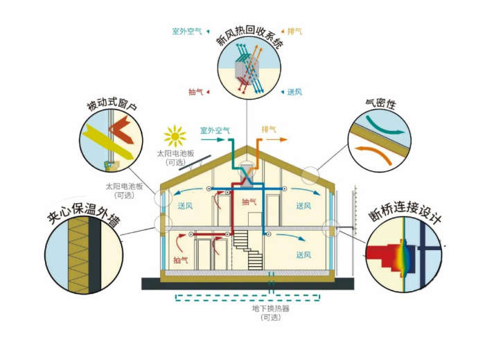 超低能耗建筑是指適應(yīng)氣候特征和自然條件,通過保溫隔熱性能和氣密性能更高的圍護結(jié)構(gòu),采用新風熱回收技術(shù),并利用可再生能源,提供舒適室內(nèi)環(huán)境的建筑。在寒冷的北歐國家超低能耗建筑概念已較為成熟。如下圖所示,超低能耗房屋設(shè)計要考慮到如下幾點: