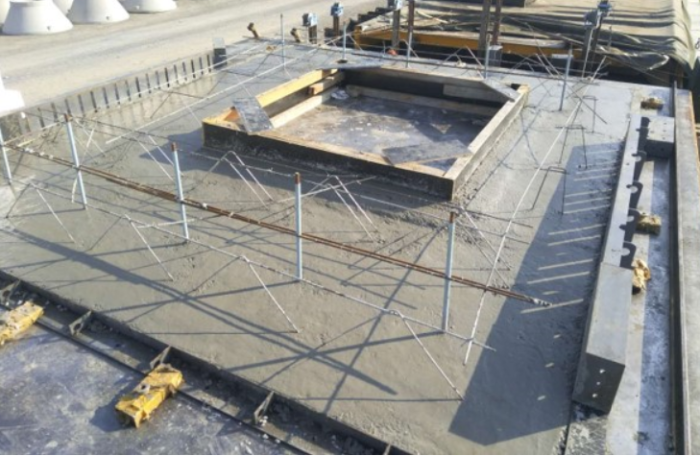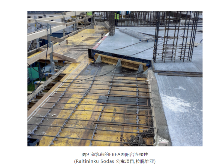 對于樓板配筋復(fù)雜程度不高的情況下使用EBEA?陽臺連接件是相當簡單的。下圖為澆筑混凝土前的連接件布置示意圖,兩側(cè)的主要配筋已經(jīng)綁扎完畢后,配筋將EBEA?陽臺連接件也固定在正確的位置. 同時, EBEA?陽臺連接件的補充配筋也已經(jīng)安裝完畢。