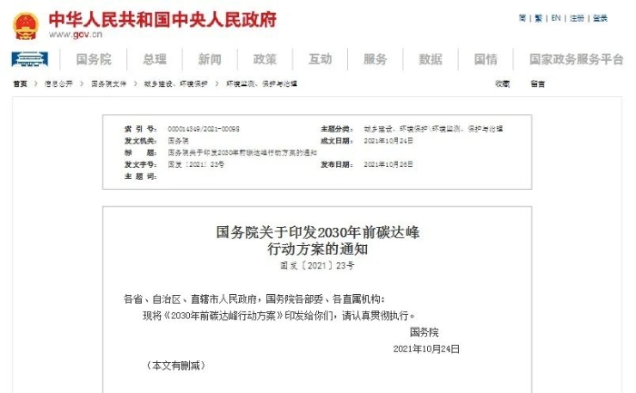 國(guó)務(wù)院關(guān)于印發(fā)2030年前碳達(dá)峰行動(dòng)方案的通知