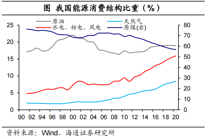 首先,在能源領域,碳達峰行動主要從兩方面出發(fā):一方面,推動重點用煤行業(yè)減煤限煤。回看我國碳排放較高的原因,主要在于化石燃料的大量消耗,其中煤炭的比重位居首位。因此,碳達峰行動明確提出,加快煤炭減量步伐,“十四五”時期嚴格合理控制煤炭消費增長,“十五五”時期逐步減少。就具體措施而言,嚴格控制新增煤電項目,有序淘汰煤電落后產能,嚴控跨區(qū)外送可再生能源電力配套煤電規(guī)模。推動重點用煤行業(yè)減煤限煤。