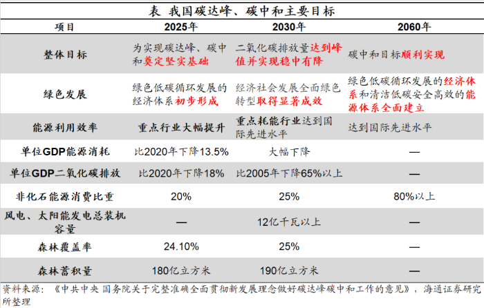 該《意見》提出了我國雙碳工作的三個目標:首先,2025年為實現(xiàn)碳達峰、碳中和奠定堅實基礎。隨后,2030年碳排放達峰后穩(wěn)中有降。最后,2060年碳中和目標順利實現(xiàn)。