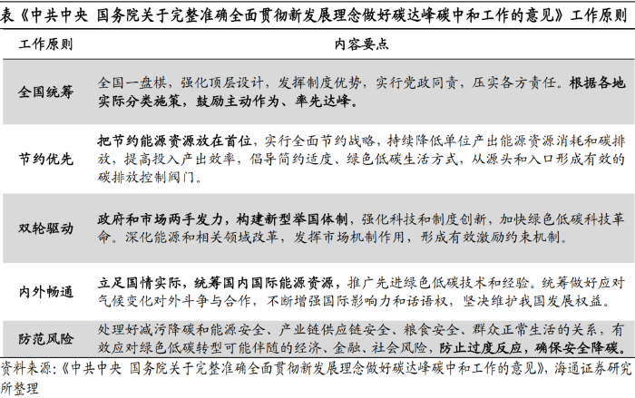 總體來說,《意見》在碳達峰碳中和“1+N”政策體系中發(fā)揮統(tǒng)領作用,明確了我國雙碳建設的路線圖、施工圖。值得一提的是,其中的工作原則也是我國《2030年前碳達峰行動方案》的總方針。