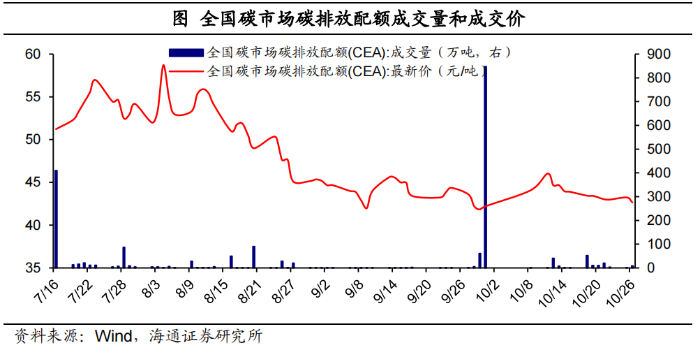 第二,建立健全市場化機制,其中完善碳市場的建設是主要舉措。盡管控制企業(yè)耗能可以有效降低碳排放,但是也一定程度上對企業(yè)的生產經營產生影響。在兼顧經濟增長和低碳建設的雙重考慮下,碳市場的建設愈發(fā)重要。7月16日,全國碳市場正式開市,發(fā)電行業(yè)成首個納入該市場的行業(yè)。截至10月26日,全國碳市場碳排放配額累計成交量1921.1萬噸,累計成交8.67億元。本次行動方案提出,逐步擴大交易行業(yè)范圍,我們預計未來水泥、鋼鐵等兩高行業(yè)會陸續(xù)納入全國碳交易市場。