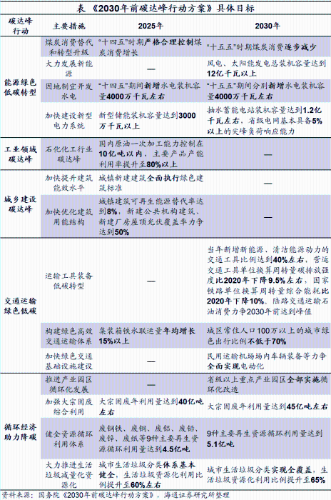 《2030年前碳達峰行動方案》主要聚焦于2030年前碳達峰目標,對推進碳達峰工作進行總體部署。值得關注的是,該方案針對不同的領域提出了碳達峰十大行動,使得我國碳達峰的路線圖更加清晰??傮w而言,碳達峰十大行動主要可以分為兩部分:第一部分,是針對重點領域和行業(yè)的碳達峰實施方案。第二部分,是碳達峰保障體系。其中,前者針對我國能源、工業(yè)、交通運輸、城鄉(xiāng)建設等領域做出了諸多部署。