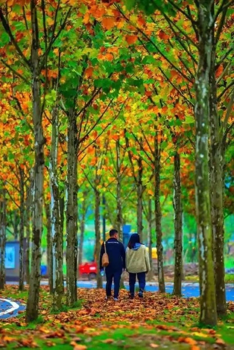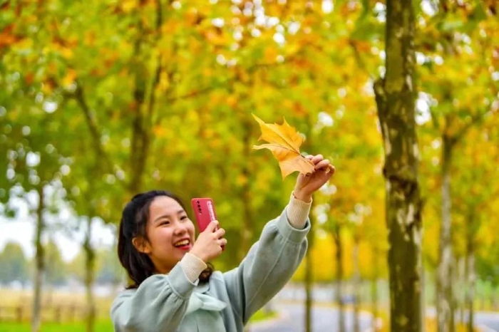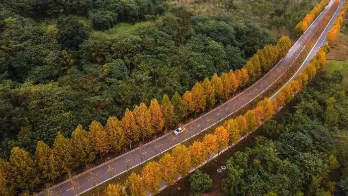 廣陽島上梧桐樹葉正由綠轉(zhuǎn)黃,一條金色大道蜿蜒在廣陽島深處,美不勝收。郭旭 攝