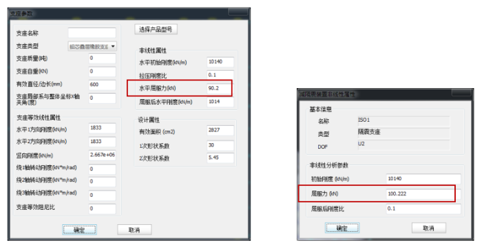 圖1 PKPM隔震支座參數(shù) 圖2 SAUSG隔震支座非線性參數(shù)
