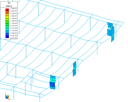 查看重力加載變形結(jié)果(如圖7所示),發(fā)現(xiàn)豎向荷載作用下,阻尼器出現(xiàn)了較大的變形。這個變形主要是由于豎向加載默認采用一次性加載的方法導(dǎo)致的。實際工程中阻尼器一般在主體結(jié)構(gòu)施工以后進行施工,因而該變形實際并不存在。