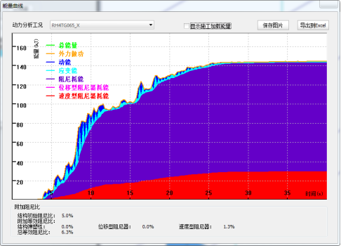 設(shè)置以后,豎向荷載作用下阻尼器變形正常,等效彈性時程分析可以正常進行,能量圖如圖10所示。由于模型X軸方向僅設(shè)置4個阻尼器,因而附加阻尼比較小,僅為1.3%。