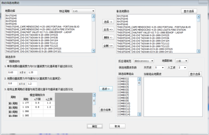 軟件進行自動選波(圖12)時,考慮時間成本,程序并非對每一條地震波進行一次彈性時程分析,而是將地震波轉(zhuǎn)換為反應(yīng)譜以后進行振型分解反應(yīng)譜分析,因而計算每條地震動的基底剪力時,可以考慮與反應(yīng)譜分析相同的周期折減系數(shù)。