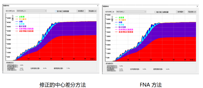 本算例中,修正中心差分方法采用10個振型,F(xiàn)NA方法采用500個振型以后,分析得到的能量圖以及附加阻尼比如圖15及圖16所示,二者基本一致。