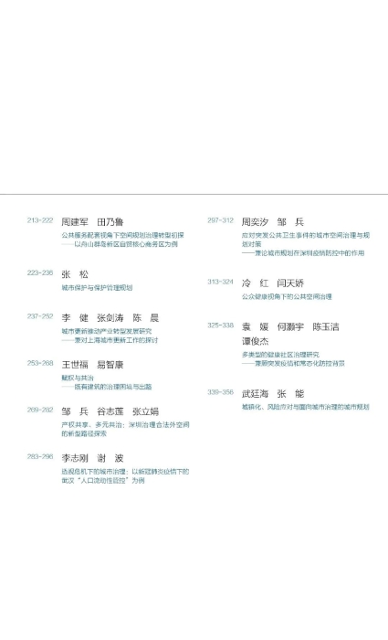 本書大致分為三部分:第一部分與治理體系和治理結(jié)構(gòu)相關(guān);第二部分主要涉及面向治理的規(guī)劃改革方向;第三部分主要是疫情防控以及由公共衛(wèi)生事件所引發(fā)的對(duì)未來城鄉(xiāng)發(fā)展及規(guī)劃的思考。三部分文章有部分交疊,關(guān)注“治理”與“規(guī)劃”的相互關(guān)系,并進(jìn)行深入探討。