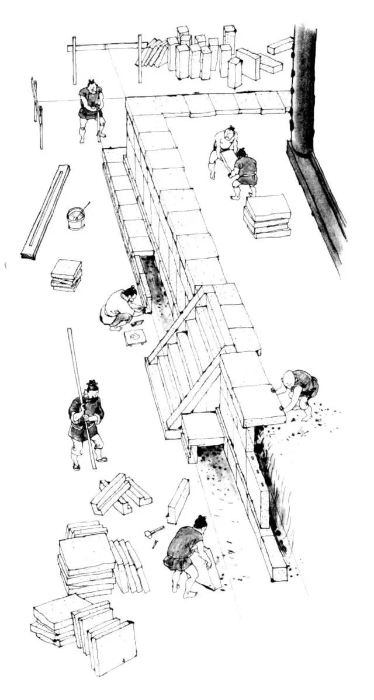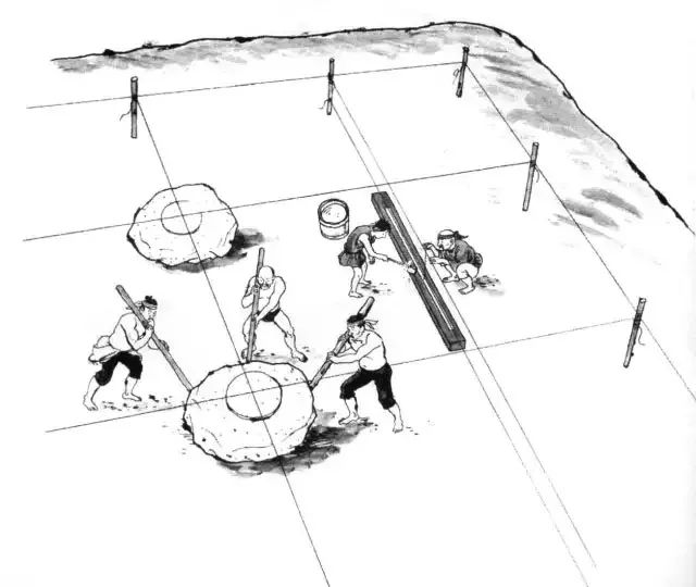 ▲ 按照建筑的開間、進深來精確定位柱礎石。