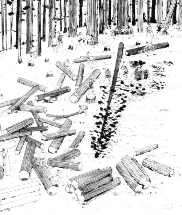 ▲ 按照需要的尺寸,把木頭加工成柱子。