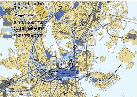 赫爾辛基地下空間總體規(guī)劃是具有法律效力的城市總體層面的規(guī)劃,其主要目標是為公共設施建設提供空間資源以及促進公用基礎設施的統(tǒng)籌布局和系統(tǒng)建設,從而提高地下空間的整體經(jīng)濟效益、安全性和環(huán)境品質。地下空間總體規(guī)劃針對城市中心建成區(qū)和外圍郊區(qū)采用了不同的規(guī)劃策略。