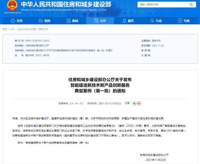 12月15日,住房和城鄉(xiāng)建設(shè)部發(fā)布智能建造新技術(shù)新產(chǎn)品創(chuàng)新服務(wù)典型案例(第一批)共124個(gè),包括5大類——自主創(chuàng)新數(shù)字化設(shè)計(jì)軟件典型案例(20項(xiàng))、部品部件智能生產(chǎn)線典型案例(29項(xiàng))、智慧施工管理系統(tǒng)典型案例(42項(xiàng))、建筑產(chǎn)業(yè)互聯(lián)網(wǎng)平臺(tái)典型案例(20項(xiàng))和建筑機(jī)器人等智能建造設(shè)備典型案例(13項(xiàng)),以總結(jié)推廣智能建造可復(fù)制經(jīng)驗(yàn)做法,指導(dǎo)各地住房和城鄉(xiāng)建設(shè)主管部門和企業(yè)全面了解、科學(xué)選用智能制造技術(shù)和產(chǎn)品。