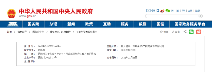 國務(wù)院關(guān)于印發(fā)“十四五”節(jié)能減排