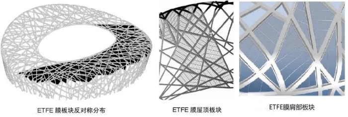 “鳥巢”的屋面由鋼結(jié)構(gòu)和膜結(jié)構(gòu)共同組成。膜結(jié)構(gòu)由兩部分構(gòu)成,上層鑲嵌在主體鋼結(jié)構(gòu)上層鋼梁區(qū)格之間的透明ETFE膜結(jié)構(gòu)和下層懸掛在主體鋼結(jié)構(gòu)下層鋼梁下面的半透PTFE膜結(jié)構(gòu)吊頂。其中上層ETFE單層張拉膜4.2萬m2,下層為PTFE膜聲學(xué)吊頂5.3萬m2。